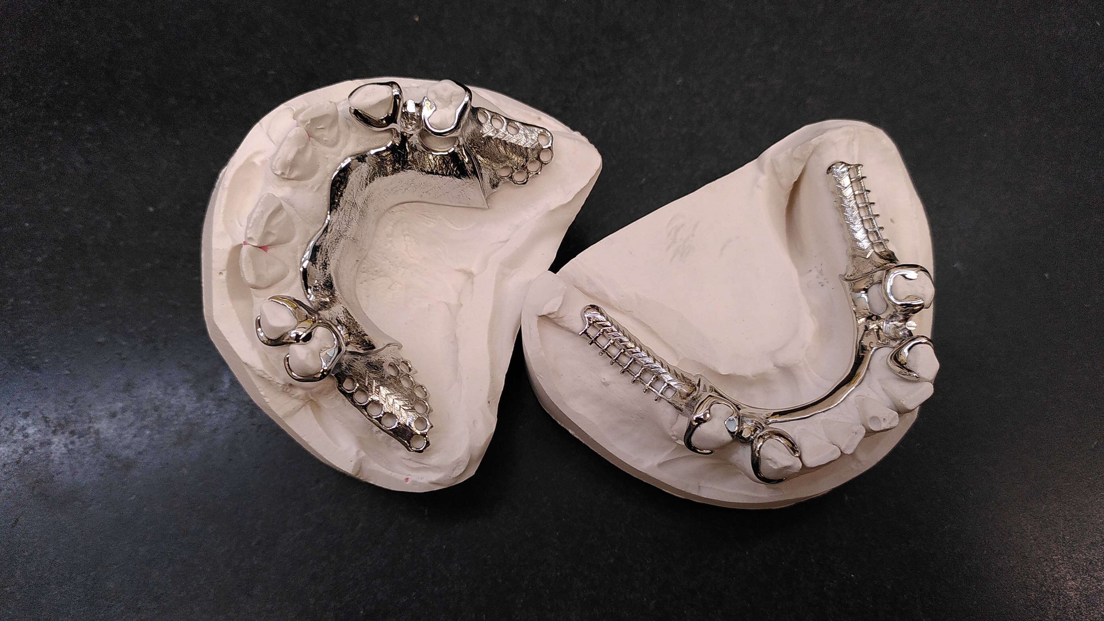 Anfertigung von Modellguss-Gerüsten nach der bewährten konventionellen Gussmethode auf digital gedruckten-, Epoxy- oder Gips-Modellen. Das Angebot reicht von der einfachen Gitterplatte bei Totalprothesen, über Klammerprothesen bis zur aufwendigen Peri-over-denture Arbeit.